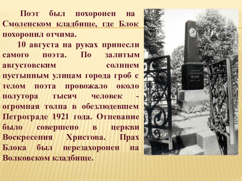 Слайд 10 Поэт был похоронен на Смоленском кладбище, где Блок похоронил отчима.