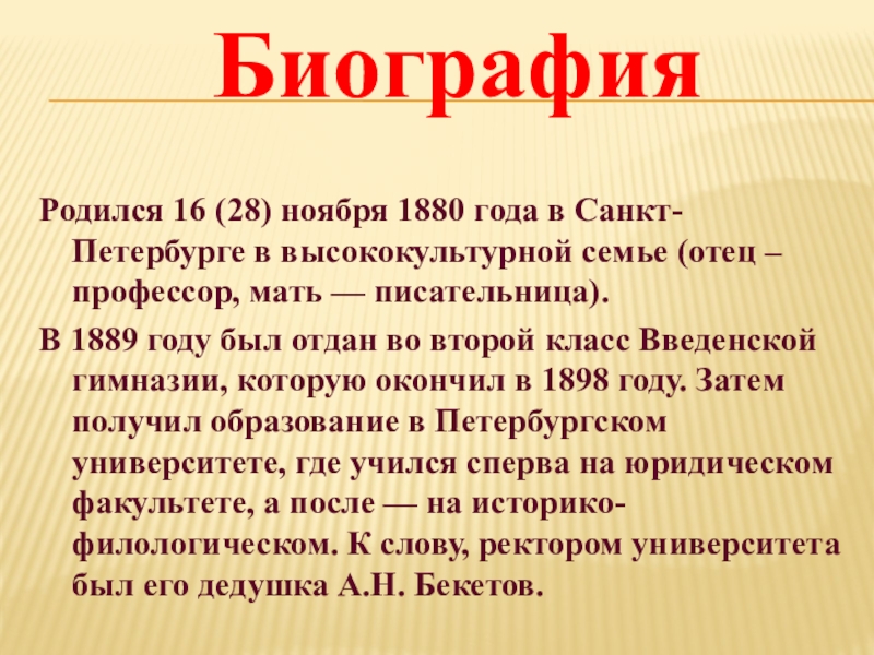 Слайд 2Родился 16 (28) ноября 1880 года в Санкт-Петербурге в высококультурной семье