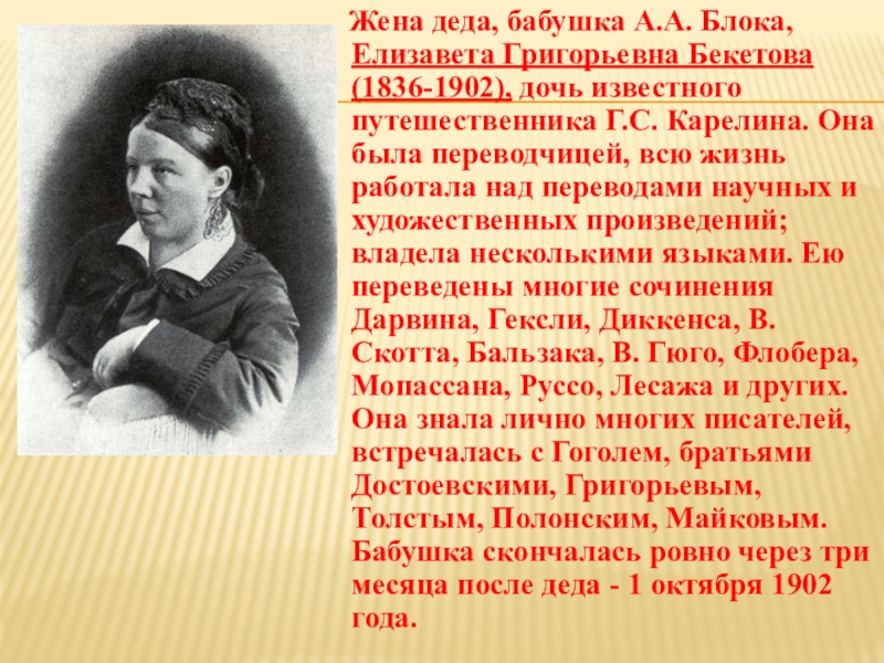 Слайд 4 Жена деда, бабушка А.А. Блока, Елизавета Григорьевна Бекетова (1836-1902),