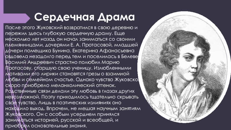 глубокую сердечную драму. Еще несколько лет назад он начал заниматься со своими племянницами, дочерями Е. А. Протасовой, младшей дочери помещика Бунина. Екатерина Афанасьевна овдовела незадолго перед тем и поселилась в Белеве. Василий Андреевич страстно полюбил Марию Протасову, старшую свою ученицу. Излюбленными мотивами его лирики становятся грезы о взаимной любви и семейном счастье. Однако чувство Жуковского скоро приобрело меланхолический оттенок. Родственные связи делали эту любовь в глазах других невозможной. Поэту приходилось тщательно скрывать свое чувство. Лишь в поэтических излияниях оно находило выход. Впрочем, не мешая научным занятиям Жуковского. Он с особым усердием принялся заниматься историей, русской и всеобщей, и приобрел основательные знания.