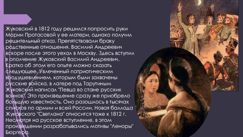 Слайд 9Жуковский в 1812 году решился попросить руки Марии Протасовой у ее