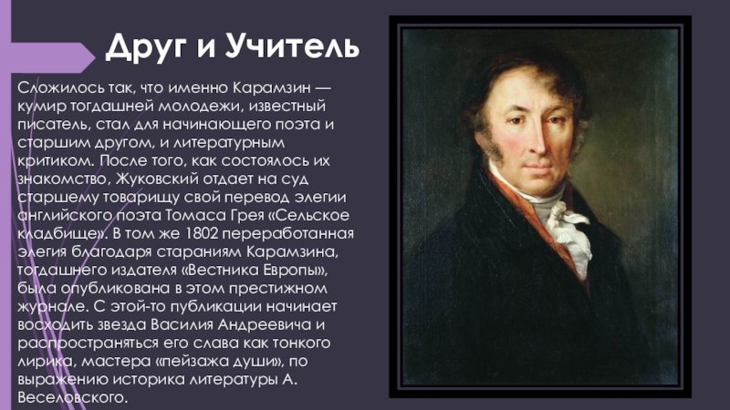 известный писатель, стал для начинающего поэта и старшим другом, и литературным критиком. После того, как состоялось их знакомство, Жуковский отдает на суд старшему товарищу свой перевод элегии английского поэта Томаса Грея «Сельское кладбище». В том же 1802 переработанная элегия благодаря стараниям Карамзина, тогдашнего издателя «Вестника Европы», была опубликована в этом престижном журнале. С этой-то публикации начинает восходить звезда Василия Андреевича и распространяться его слава как тонкого лирика, мастера «пейзажа души», по выражению историка литературы А. Веселовского.
