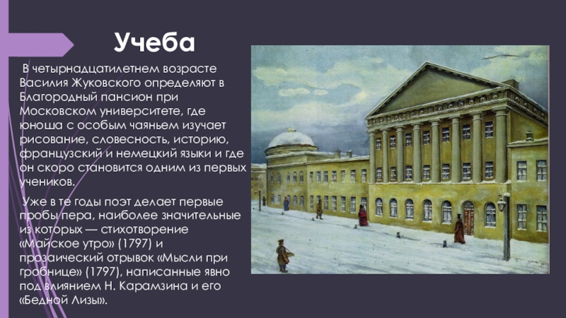 В четырнадцатилетнем возрасте Василия Жуковского определяют в Благородный пансион при