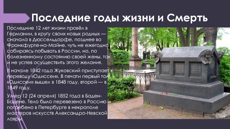 на него, было благотворным. А теперь ответим на вопрос о том, как сложилась личная жизнь Василия Жуковского. В Дюссельдорфе 21 апреля 1841 года состоялось бракосочетание Василия Андреевича (ему в то время уже исполнилось 58 лет) с 19-летней Елизаветой Евграфовной Рейтерн (1821—1856), дочерью его давнишнего приятеля, живописца Е. Р. Рейтерна. Жуковский провел последние 12 лет своей жизни в Германии с семьей супруги.