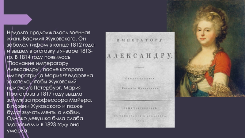 1812 года и вышел в отставку в январе 1813-го. В 1814 году появилось "Послание императору Александру", после которого императрица Мария Федоровна захотела, чтобы Жуковский приехал в Петербург. Мария Протасова в 1817 году вышла замуж за профессора Майера. В поэзии Жуковского и позже будут звучать мечты о любви. Однако девушка была слаба здоровьем и в 1823 году она умерла.