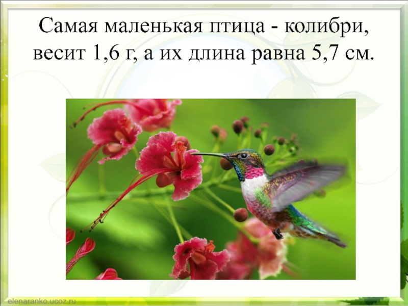 Слайд 7Самая маленькая птица - колибри, весит 1,6 г, а их длина равна