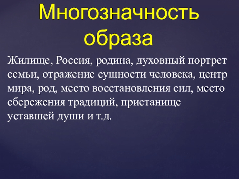 Многозначность образаЖилище, Россия, родина, духовный портрет семьи, отражение сущности человека, центр мира, род, место восстановления сил, место