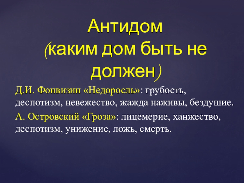 Антидом  (каким дом быть не должен) Д.И. Фонвизин «Недоросль»: грубость, деспотизм, невежество, жажда наживы, бездушие.А. Островский