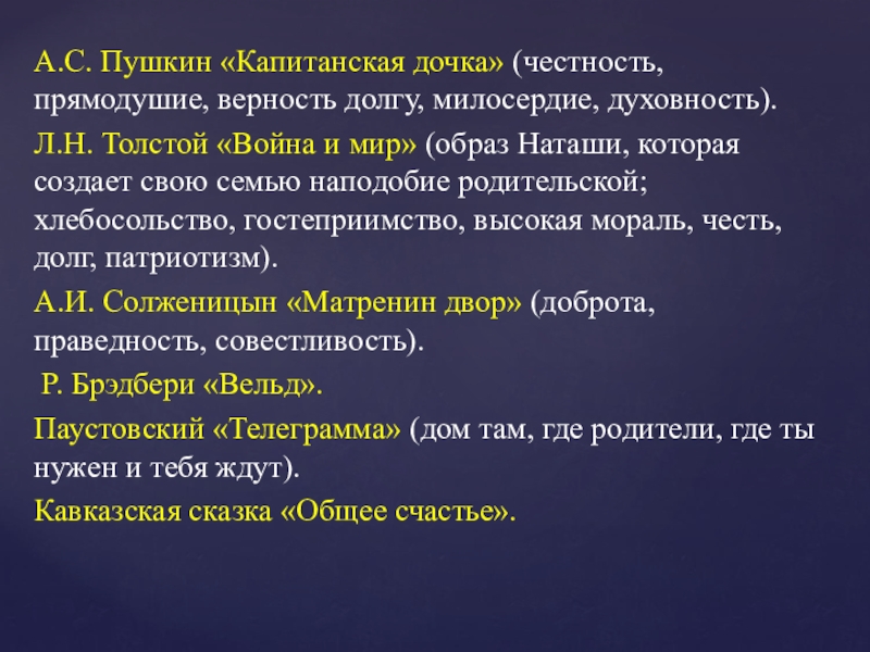 Слайд 4А.С. Пушкин «Капитанская дочка» (честность, прямодушие, верность долгу, милосердие, духовность).