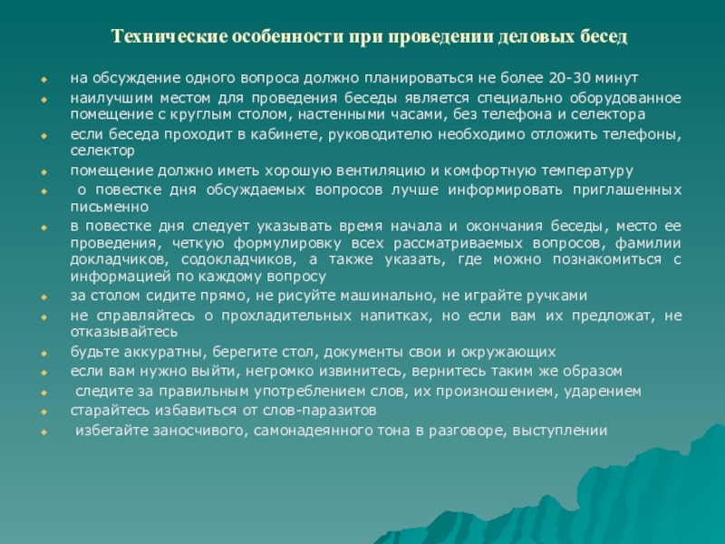 3. Следует постоянно помнить о временных рамках беседы: лаконичность – одно из основных требований к деловому разговору.