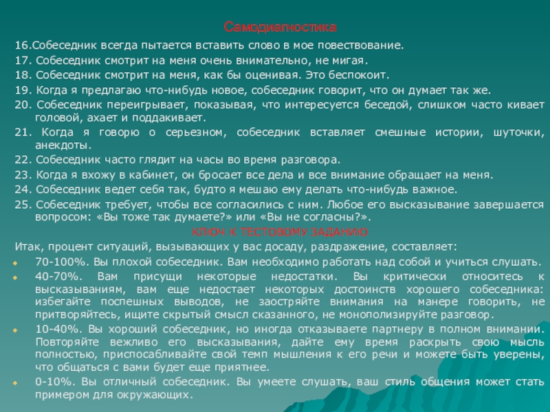 40-70%. Вам присущи некоторые недостатки. Вы критически относитесь к высказываниям, вам еще недостает некоторых достоинств хорошего собеседника: избегайте поспешных выводов, не заостряйте внимания на манере говорить, не притворяйтесь, ищите скрытый смысл сказанного, не монополизируйте разговор.