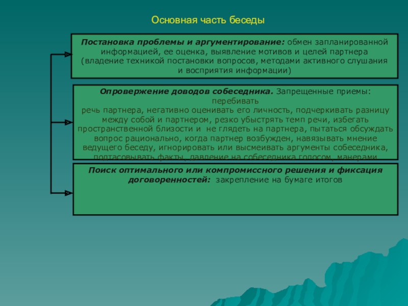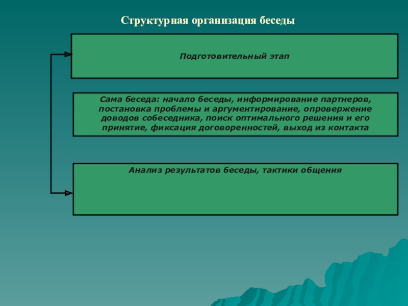 Рациональная организация процесса беседы, что означает краткое изложение собеседниками содержания информации по обсуждаемой теме, так как пространное изложение и избыточная информация осложняют усвоение самого существенного.