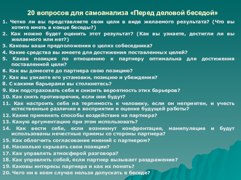 Слайд 820 вопросов для самоанализа «Перед деловой беседой»