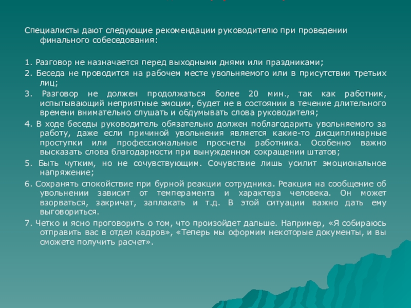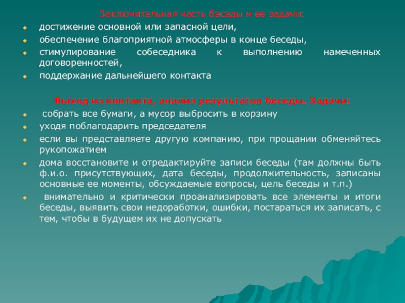 внимательно и критически проанализировать все элементы и итоги беседы, выявить свои недоработки, ошибки, постараться их записать, с тем, чтобы в будущем их не допускать