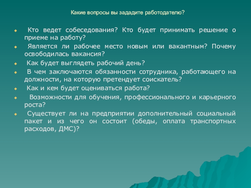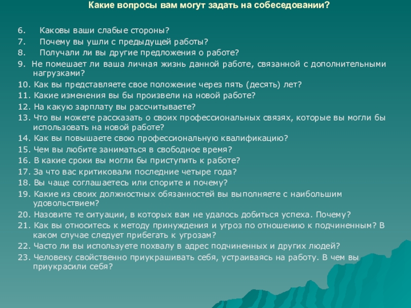 Контрольные – для проверки, следит ли партнер за вашей мыслью, достоверны ли его ответы: «Хотели бы вы перейти на другую работу?», «Вернулись бы вы на прежнее место работы?»;