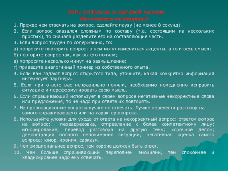 10. Чем больше спрашивающий переполнен эмоциями, тем спокойнее и хладнокровнее надо ему отвечать.