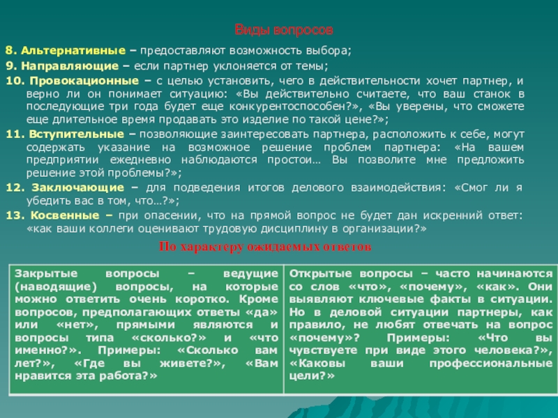 10. Провокационные – с целью установить, чего в действительности хочет партнер, и верно ли он понимает ситуацию: «Вы действительно считаете, что ваш станок в последующие три года будет еще конкурентоспособен?», «Вы уверены, что сможете еще длительное время продавать это изделие по такой цене?»;