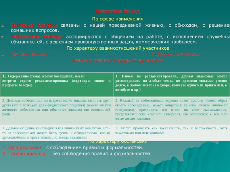 В теории управления: «Деловая беседа – вид делового общения, специально организованный предметный разговор, служащий решению управленческих задач».