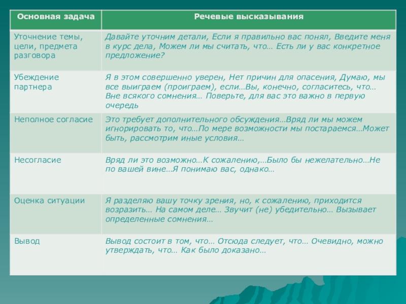 Для ориентации – придерживается ли партнер ранее высказанного им мнения: «Есть ли у вас еще вопросы по этой теме?», «Поняли ли вы, какую цель мы при этом преследуем?»;