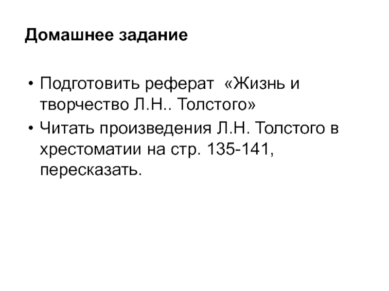 Домашнее заданиеПодготовить реферат «Жизнь и творчество Л.Н.. Толстого»Читать произведения Л.Н. Толстого в хрестоматии на стр. 135-141, пересказать.