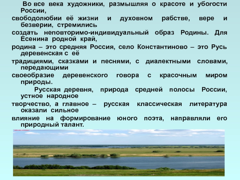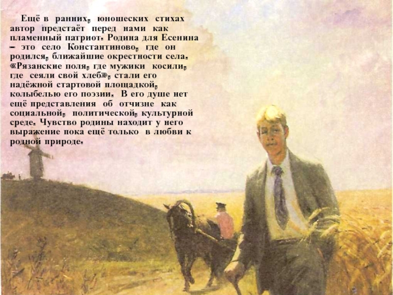 пламенный патриот. Родина для Есенина – это село Константиново, где он родился, ближайшие окрестности села. «Рязанские поля, где мужики косили, где сеяли свой хлеб», стали его надёжной стартовой площадкой, колыбелью его поэзии. В его душе нет ещё представления об отчизне как социальной, политической, культурной среде. Чувство родины находит у него выражение пока ещё только в любви к родной природе.