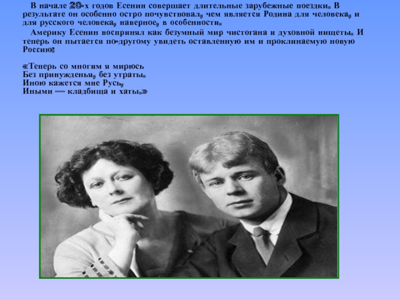 Слайд 11В начале 20-х годов Есенин совершает длительные зарубежные поездки. В результате