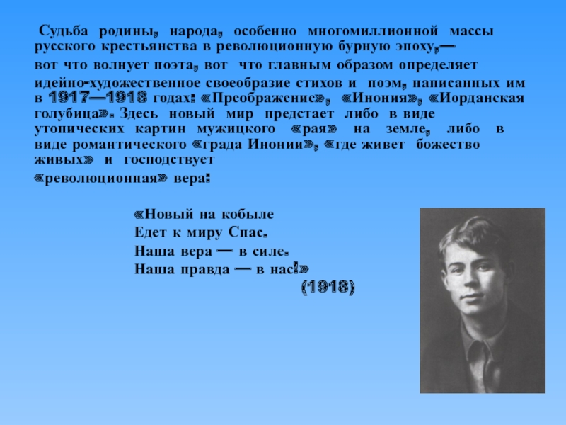 идейно-художественное своеобразие стихов и поэм, написанных им в 1917—1918 годах: «Преображение», «Инония», «Иорданская голубица». Здесь новый мир предстает либо в виде утопических картин мужицкого «рая» на земле, либо в виде романтического «града Инонии», «где живет божество живых» и господствует