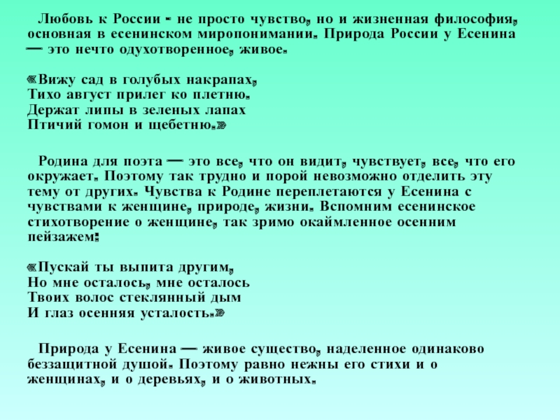 Природа у Есенина — живое существо, наделенное одинаково беззащитной душой. Поэтому равно нежны его стихи и о женщинах, и о деревьях, и о животных.