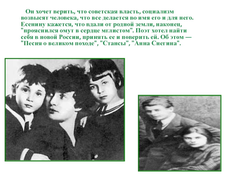 делается во имя его и для него. Есенину кажется, что вдали от родной земли, наконец, "прояснился омут в сердце мглистом". Поэт хотел найти себя в новой России, принять ее и поверить ей. Об этом — "Песня о великом походе", "Стансы", "Анна Снегина".