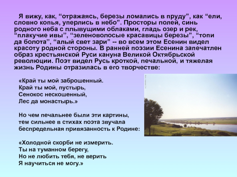Слайд 8На страницах ранней есенинской лирики перед нами предстаёт скромный, но прекрасный,