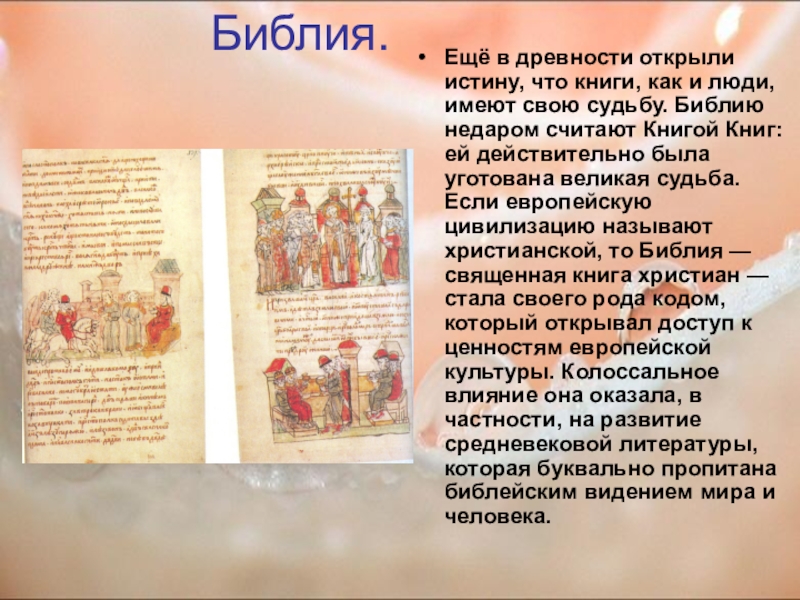 свою судьбу. Библию недаром считают Книгой Книг: ей действительно была уготована великая судьба. Если европейскую цивилизацию называют христианской, то Библия — священная книга христиан — стала своего рода кодом, который открывал доступ к ценностям европейской культуры. Колоссальное влияние она оказала, в частности, на развитие средневековой литературы, которая буквально пропитана библейским видением мира и человека.