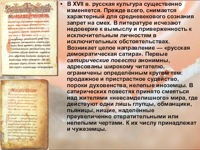 для средневекового сознания запрет на смех. В литературе исчезают недоверие к вымыслу и приверженность к исключительным личностям в исключительных обстоятельствах. Возникает целое направление — «русская демократическая сатира». Первые сатирические повести анонимны, адресованы широкому читателю, ограничены определённым кругом тем: продажное и пристрастное судейство, пороки духовенства, нелепые иноземцы. В сатирических повестях принято смеяться над жителями «невсамделишного» мира, где действуют одни лишь глупцы, обманщики, пьяницы, нищие, наделённые преувеличенно отвратительными или нелепыми чертами. К их числу принадлежат и чужеземцы.