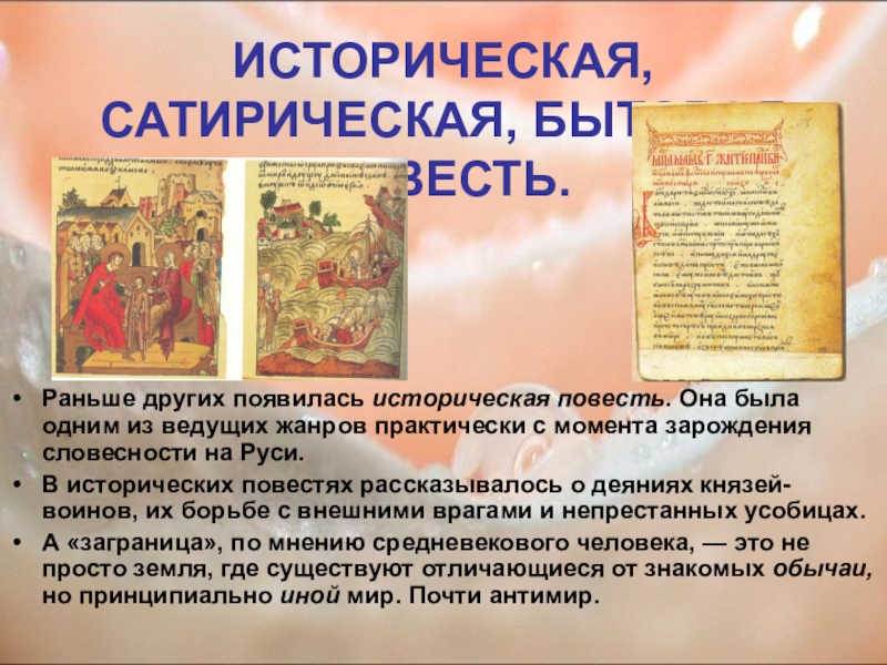 Слайд 16ИСТОРИЧЕСКАЯ, САТИРИЧЕСКАЯ, БЫТОВАЯ ПОВЕСТЬ.