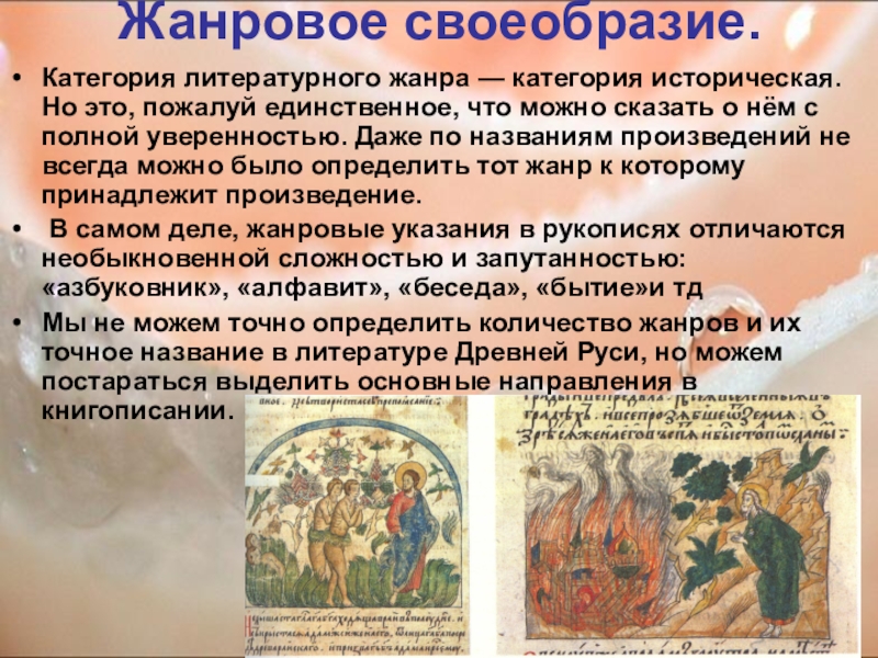 Мы не можем точно определить количество жанров и их точное название в литературе Древней Руси, но можем постараться выделить основные направления в книгописании.