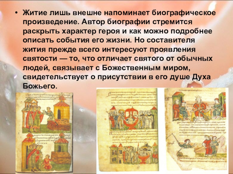 Слайд 15Житие лишь внешне напоминает биографическое произведение. Автор биографии стремится раскрыть характер