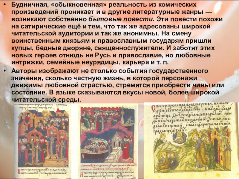 Слайд 18Будничная, «обыкновенная» реальность из комических произведений проникает и в другие литературные