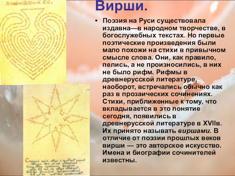 первые поэтические произведения были мало похожи на стихи в привычном смысле слова. Они, как правило, пелись, а не произносились, в них не было рифм. Рифмы в древнерусской литературе, наоборот, встречались обычно как раз в прозаических сочинениях. Стихи, приближенные к тому, что вкладывается в это понятие сегодня, появились в древнерусской литературе в XVIIв. Их принято называть виршами. В отличие от поэзии прошлых веков вирши — это авторское искусство. Имена и биографии сочинителей известны.