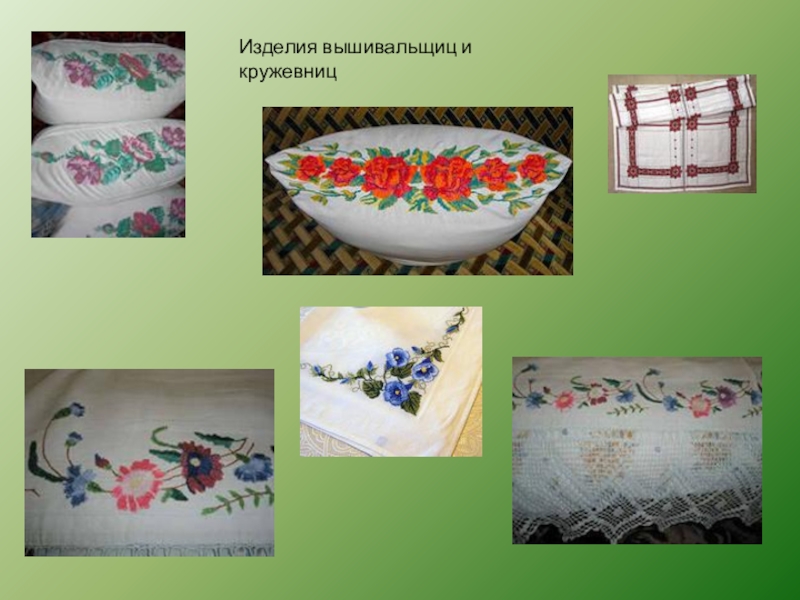 Слайд 11Изделия вышивальщиц и кружевниц