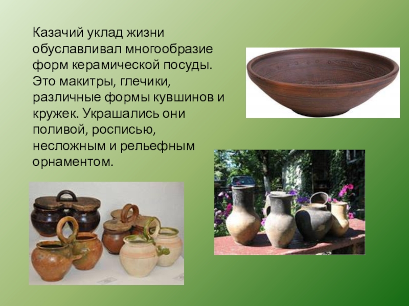 Слайд 4Казачий уклад жизни обуславливал многообразие форм керамической посуды. Это макитры, глечики,