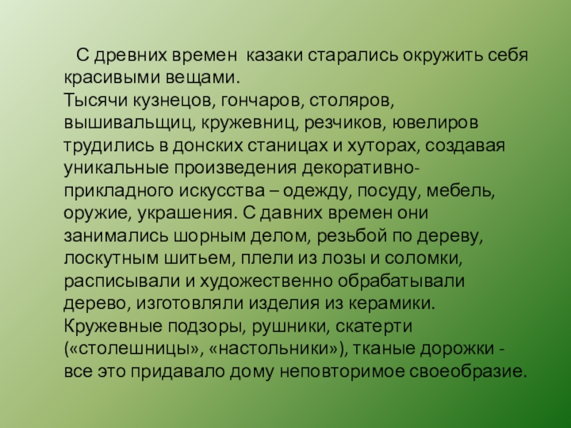 С древних времен казаки старались окружить себя красивыми вещами.Тысячи кузнецов, гончаров, столяров, вышивальщиц, кружевниц, резчиков, ювелиров трудились в донских станицах и хуторах, создавая уникальные произведения декоративно-прикладного искусства – одежду, посуду, мебель, оружие, украшения. С