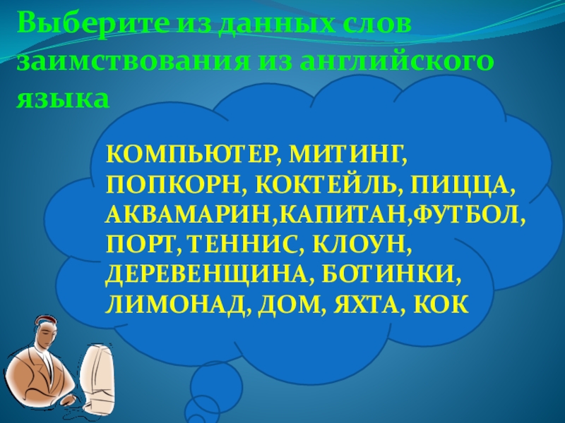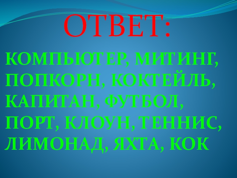 КОМПЬЮТЕР, МИТИНГ, ПОПКОРН, КОКТЕЙЛЬ, ПИЦЦА, АКВАМАРИН,КАПИТАН,ФУТБОЛ, ПОРТ, ТЕННИС, КЛОУН, ДЕРЕВЕНЩИНА, БОТИНКИ, ЛИМОНАД, ДОМ, ЯХТА, КОК