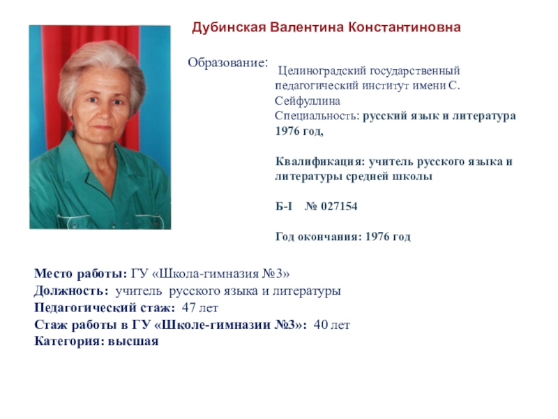 Квалификация: учитель русского языка и литературы средней школы