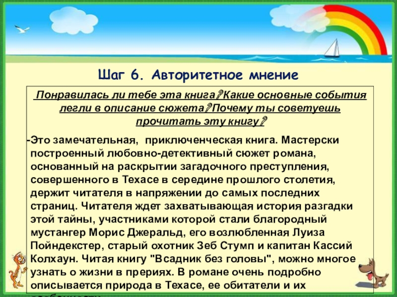 Мне нравится читать произведения приключенческой литературы. О книге «Всадник без головы» я слышала давно, и мне очень хотелось ее прочитать. Создавая рекламу этой книги, мне больше всего понравилось задание, связанное с составлением слогана. Затруднение вызвал рекомендательный список.