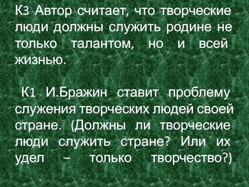 Слайд 17К3 Автор считает, что творческие люди должны служить родине не только