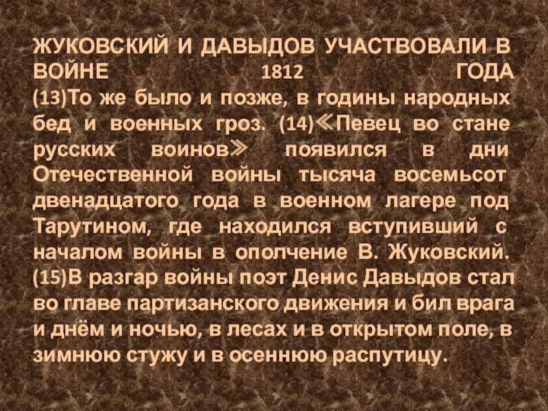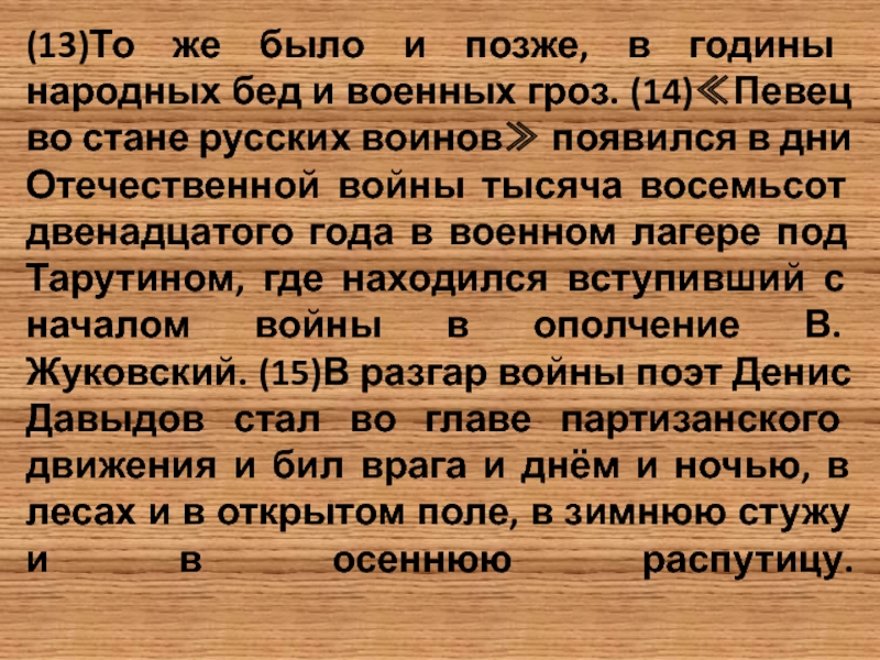 позже, в годины народных бед и военных гроз. (14)≪Певец во стане русских воинов≫ появился в дни Отечественной войны тысяча восемьсот двенадцатого года в военном лагере под Тарутином, где находился вступивший с началом войны в ополчение В. Жуковский. (15)В разгар войны поэт Денис Давыдов стал во главе партизанского движения и бил врага и днём и ночью, в лесах и в открытом поле, в зимнюю стужу и в осеннюю распутицу.