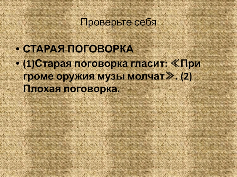 поговорка гласит: ≪При громе оружия музы молчат≫. (2)Плохая поговорка.
