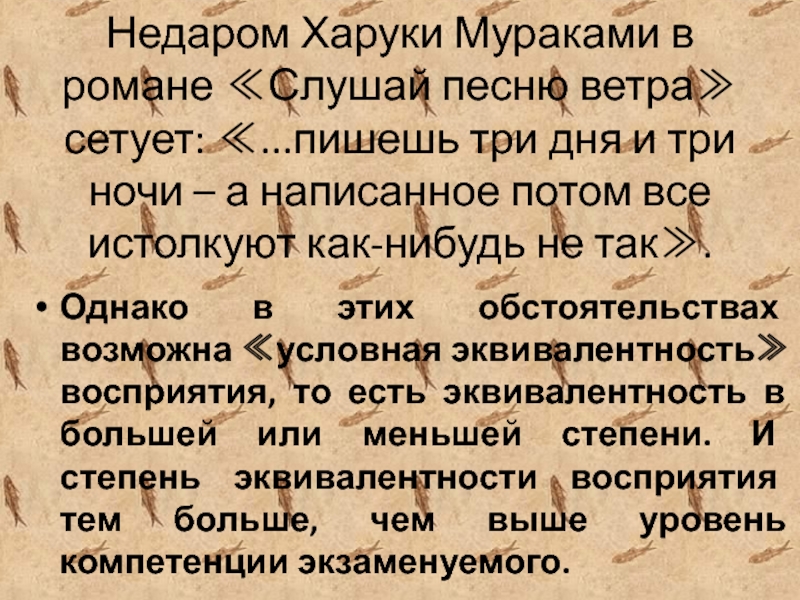 Слайд 5Недаром Харуки Мураками в романе ≪Слушай песню ветра≫ сетует: ≪...пишешь три