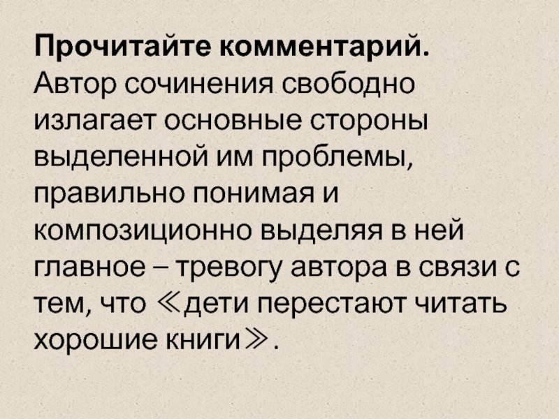 Именно комментарий выделенной экзаменуемым проблемы показывает, насколько глубоко и полно он понял эту проблему, сумел увидеть ее аспекты, намеченные автором, сумел проследить за ходом авторской мысли.