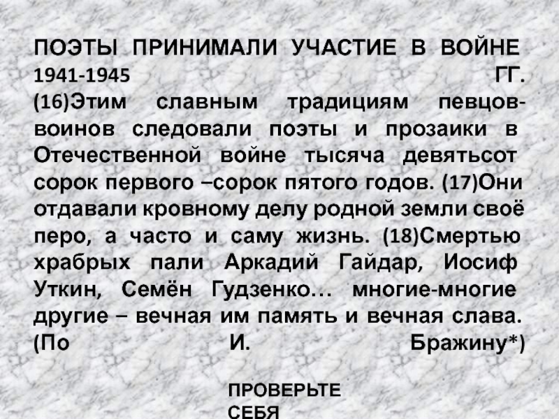 тысяча девятьсот сорок первого –сорок пятого годов. (17)Они отдавали кровному делу родной земли своё перо, а часто и саму жизнь. (18)Смертью храбрых пали Аркадий Гайдар, Иосиф Уткин, Семён Гудзенко… многие-многие другие – вечная им память и вечная слава. (По И. Бражину*)