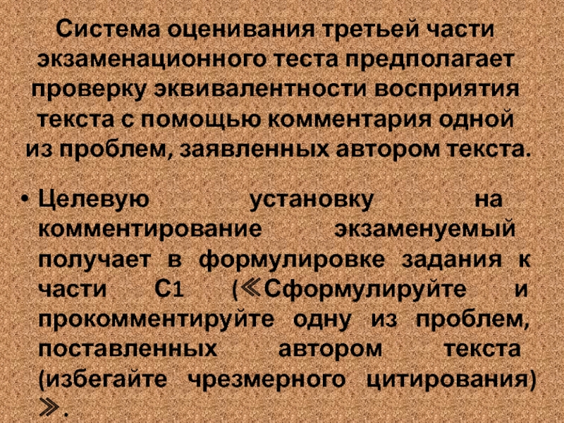 Целевую установку на комментирование экзаменуемый получает в формулировке задания к части С1 (≪Сформулируйте и прокомментируйте одну из проблем, поставленных автором текста (избегайте чрезмерного цитирования)≫.